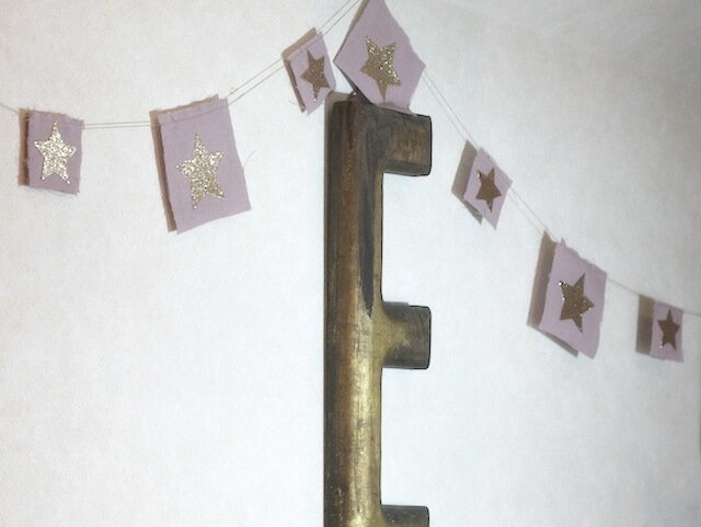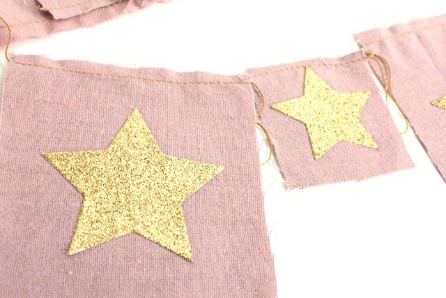 粗く織った薄手の帆布を手染めにして、グリッタープリントの 星形の生地を接着しています。